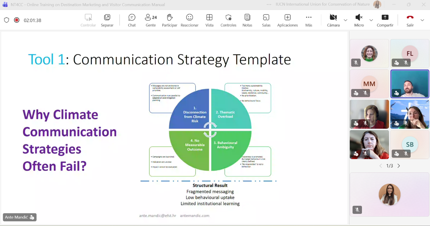The training opened with contributions from IUCN MED and experts from the Institute for Tourism, who presented the objectives of the manual and its role in helping destinations move beyond traditional promotion. Climate-smart marketing encourages destinations to communicate climate action as a shared responsibility and an opportunity, combining urgency with solution-oriented storytelling. Transparent and inclusive narratives that reflect real actions (rather than vague sustainability claims) are essential for building trust with visitors and local stakeholders.